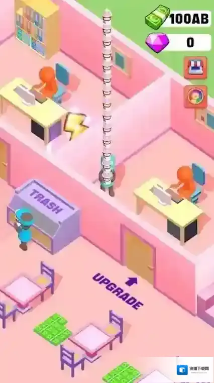 3、呈现办公场所场景,有角色、货币(100AB)、钻石(0)、“UPGRADE(升级)”提示等,玩法应是经营管理空间、升级设施、服务角色,属于休闲益智的模拟经营品类。