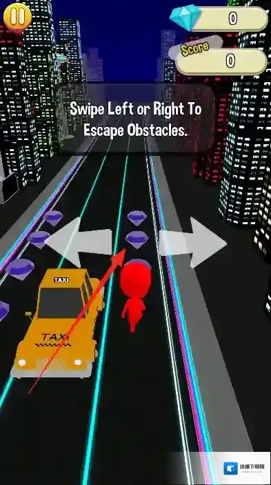 2、中期赛道出现颜色随机变换的动态障碍物,迅速点击颜色按钮切换至黄色,侧身躲过紫色障碍,顺势收集路径上的金色钻石。