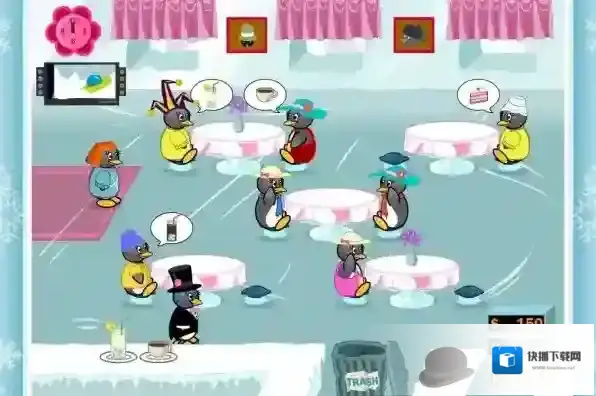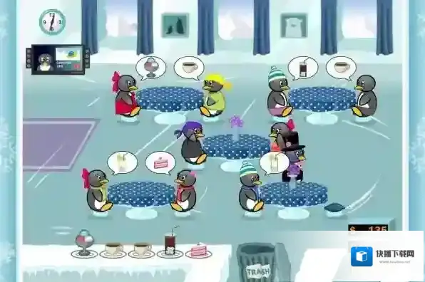 1、日常经营操作:玩家需点击顾客快速安排就座,顾客招手时及时上前点餐,随后操控企鹅员工取餐上菜,全程考验手速与反应力。
