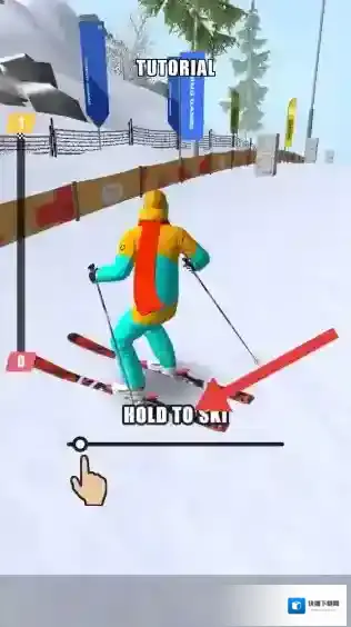 1、在TUTORIAL阶段,长按屏幕HOLD TO SKI,控制滑雪者在雪道滑行,熟悉操作。