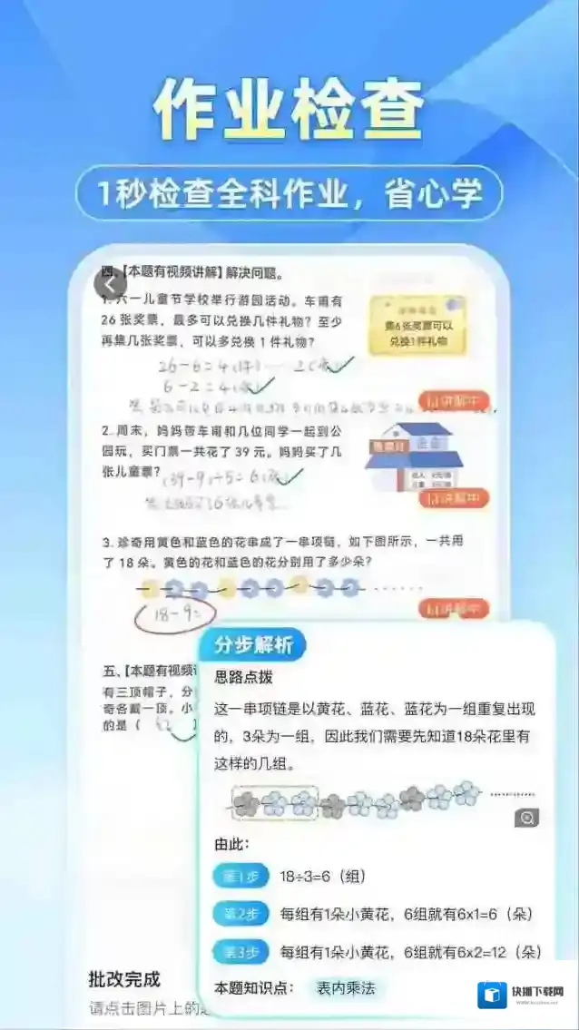3、口算批改,这款软件能用于一键拍照批改作业,让孩子在家学习和检验自己学习成果更方便。