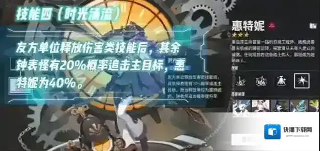 技能四(时光涌流):友方单位释放伤害类技能后,其余钟表怪有20%概率追击主目标,惠特妮为40%。