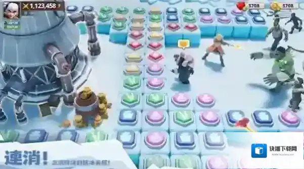 2、在消除界面,连消同色方块(红箭头),触发技能,协助战斗,突破“冰封冰层”。
