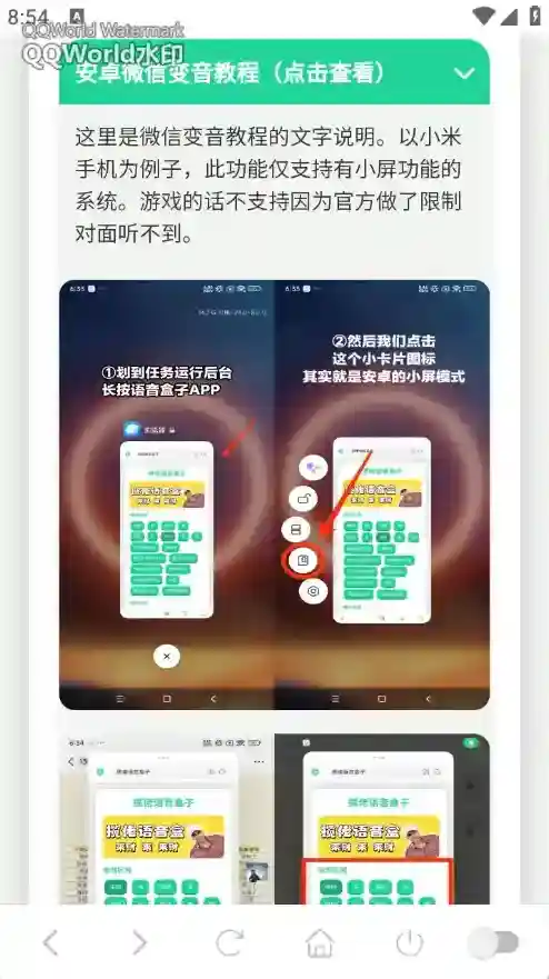 这里是QQ变音教程的文字说明。以小米手机为例子,此功能仅支持有小屏功能的系统。游戏的话不支持因为官方做了限制对面听不到。