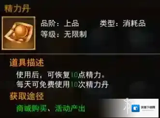 4、精力丹是恢复精力值的重要道具,使用后可恢复角色10点精力值。精力丹的获取来源包括每日累计活动以及完成江湖录任务。