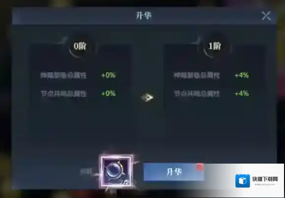 可以消耗神谕之兆来提升神赐升华等级。提升后,已穿戴的神赐装备的属性和节点共鸣的固定值属性将按百分比提高。若孔位未穿戴神赐装备,则加成属性不生效。