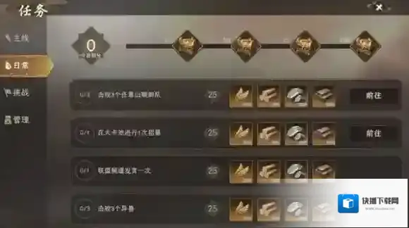 除主线任务外,游戏中还提供了许多日常玩法,点击任务面板左侧的日常任务即可查看当前所有可完成或待领取的每日任务及奖励。