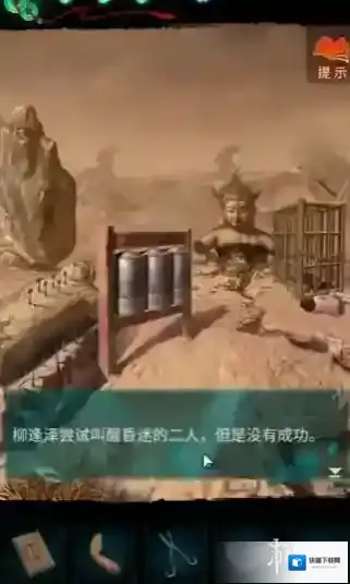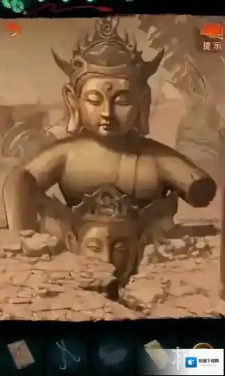 3、进入小门后,玩家可以看到众多的佛像。接着,玩家的目光被左侧躺着的佛像尖刺机关所吸引。这个机关设计精巧,在成功调整机关后,玩家可以获取珠子以及雕像断臂等重要物品。