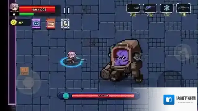 生命值9999,两种攻击模式:①发射环形弹幕 ②翻滚冲撞(参考小紫球,伤害50),翻滚后概率召唤小紫球。推荐用弓箭攻击(易瞄准、伤害高),注意其翻滚速度超过玩家移动速度,需及时闪避。击败后掉落狙击枪,出现关卡2-8。